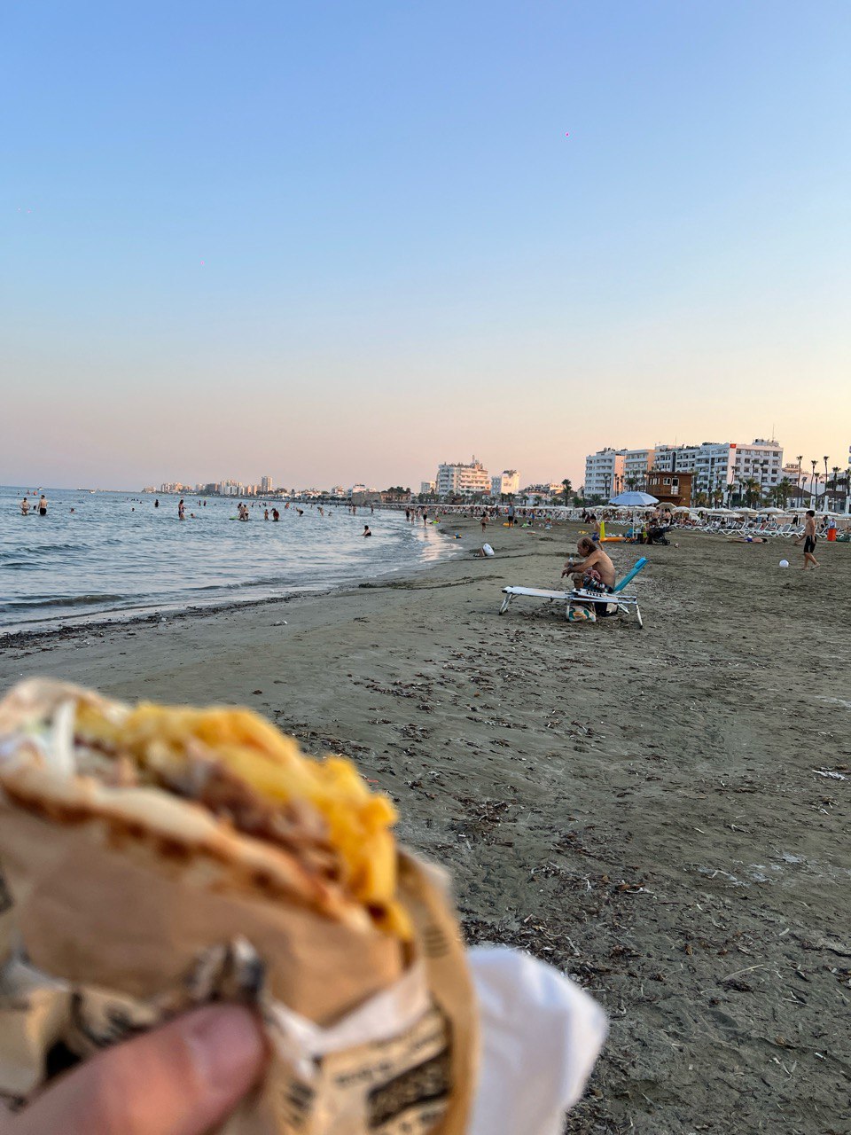 По прилёту я направился на пляж, по пути купил греческий гирос.